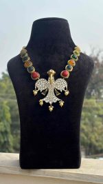 Garud Shakti Pendant is a powerful expression of heritage and craftsmanship, inspired by the majestic eagle — a symbol of strength, vision, and royalty. Crafted in high-quality brass, this statement pendant features intricate kundan detailing highlighted with vibrant, colourful stones that add a striking contrast and regal charm.