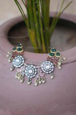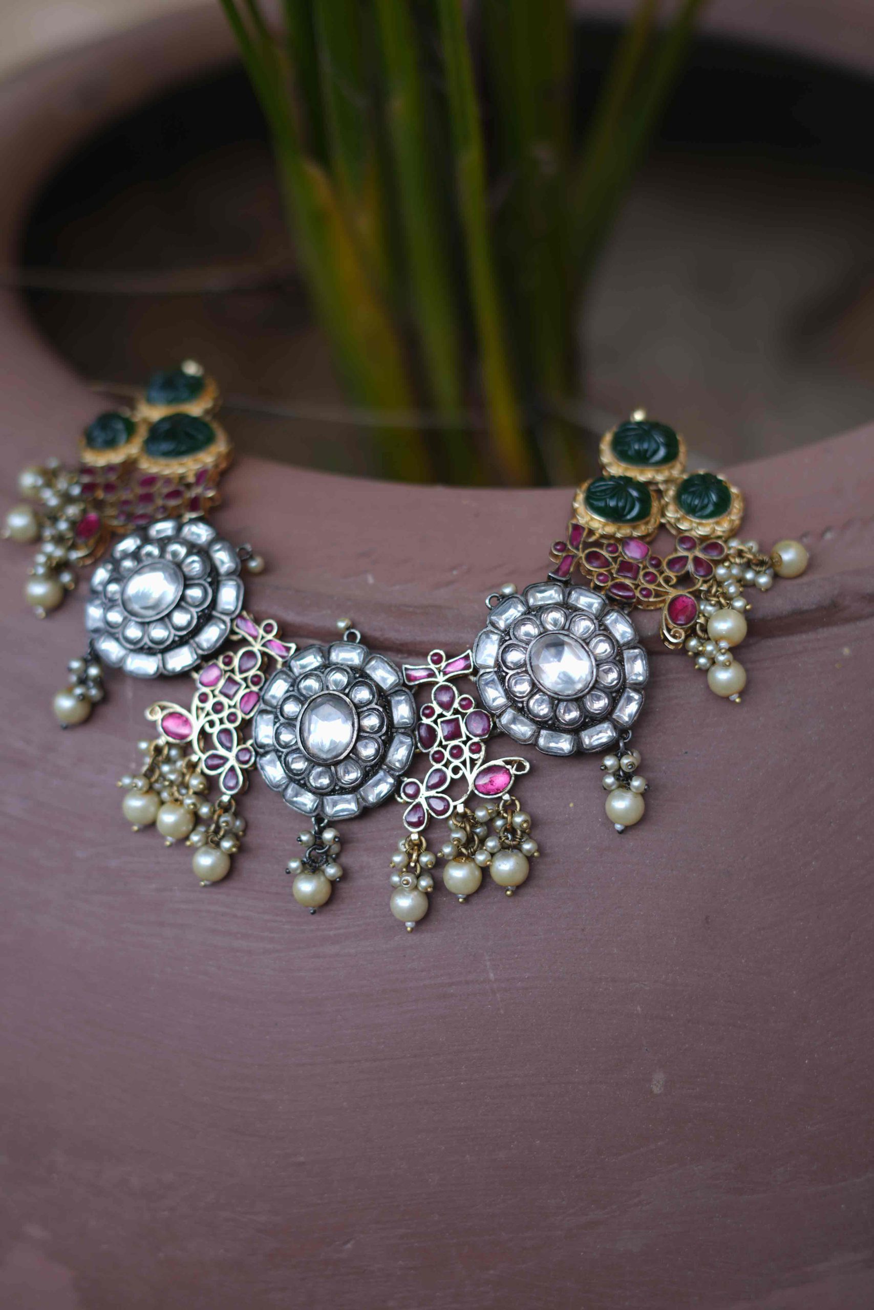 Clusters of green stones bring a refreshing contrast, symbolizing prosperity and regal beauty. Each element is further enhanced with hand-strung white pearl detailing, giving the choker a luxurious finish reminiscent of royal heirlooms.